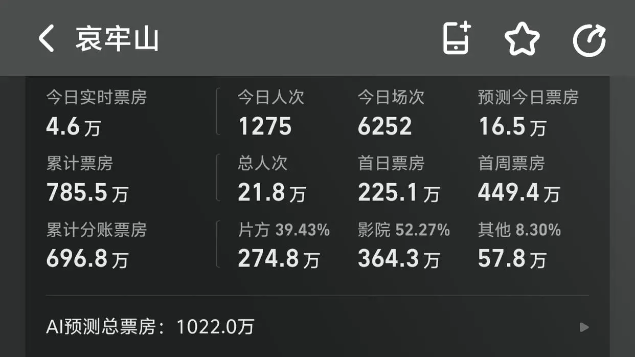 从3月13号上映到发文时间,该片获得了785万票房,猫眼专业预测总票房919.9万,灯塔AI预测总票房1022万。