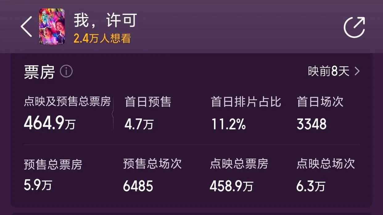 电影《我,许可》是3月20号开启的点映,截止发文时间已经拿到了464.9万的点映及预售总票房。
