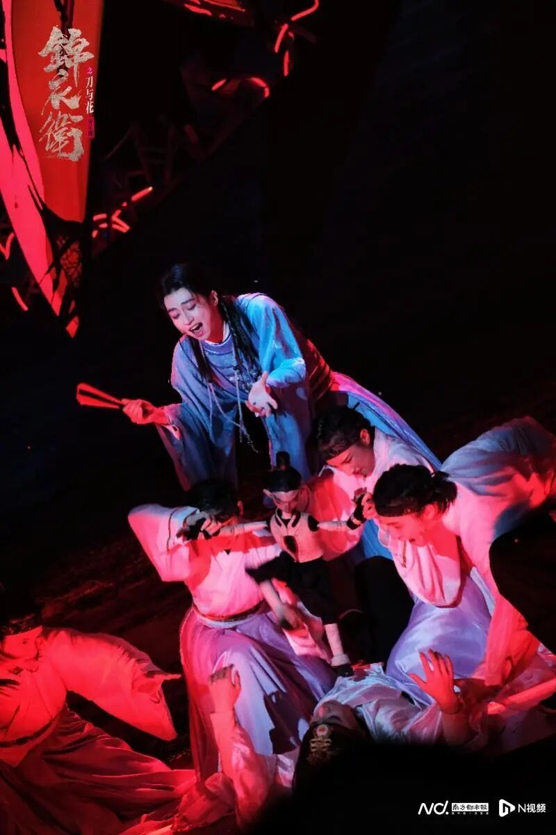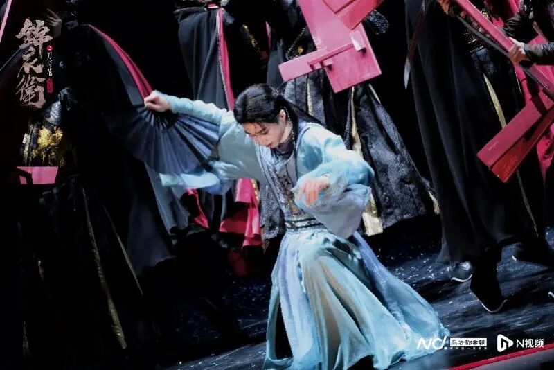 剧名中的“刀”象征杀戮与保护的双重性,“花”隐喻希望与小人物的命运,是贯穿全剧的情感张力的主题。作曲张博将戏曲元素与电音、嘻哈、美声等多元风格结合,风舞阳的嘻哈旋律凸显其灵动跳脱,而梅霜花的咏叹调《升天》以美声高音撕裂剧场氛围。舞台视觉上,红黑主色调构建出锦衣卫世界特有的肃杀与华丽,七把巨型绣春刀森然林立,条凳堆砌如无名碑林——视觉本身,已成为叙事的延伸与批判的注脚。而导演刘晓邑的编舞更是一场颠覆——他将传统武术解构重组,创造出一种写意而充满力量的现代肢体语言,赋予角色鲜明的肢体语言。风舞阳的舞蹈融入彝族舞的灵巧动感,梅霜花则以扇子古典舞传递深宫压抑感。